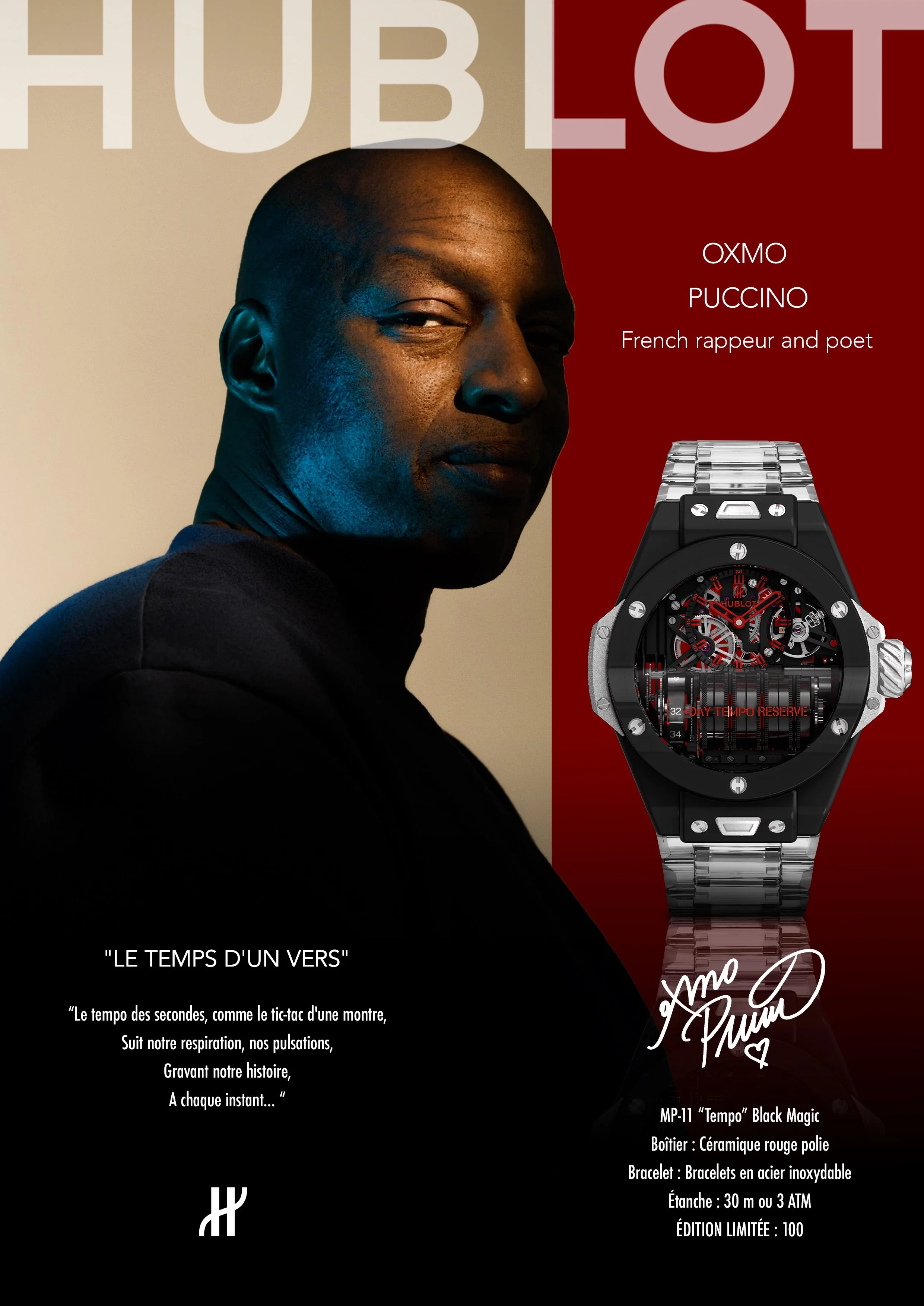 Imaginer une collaboration entre la maison horlogère Hublot et l’artiste Oxmo Puccino, en créant une campagne de marque cohérente, innovante et émotionnelle. L’objectif : donner vie à un concept de produit et de storytelling qui lie l’art du temps (Hublot) à l’art du verbe (Oxmo), et capter une cible jeune et sensible à la culture rap et poétique.